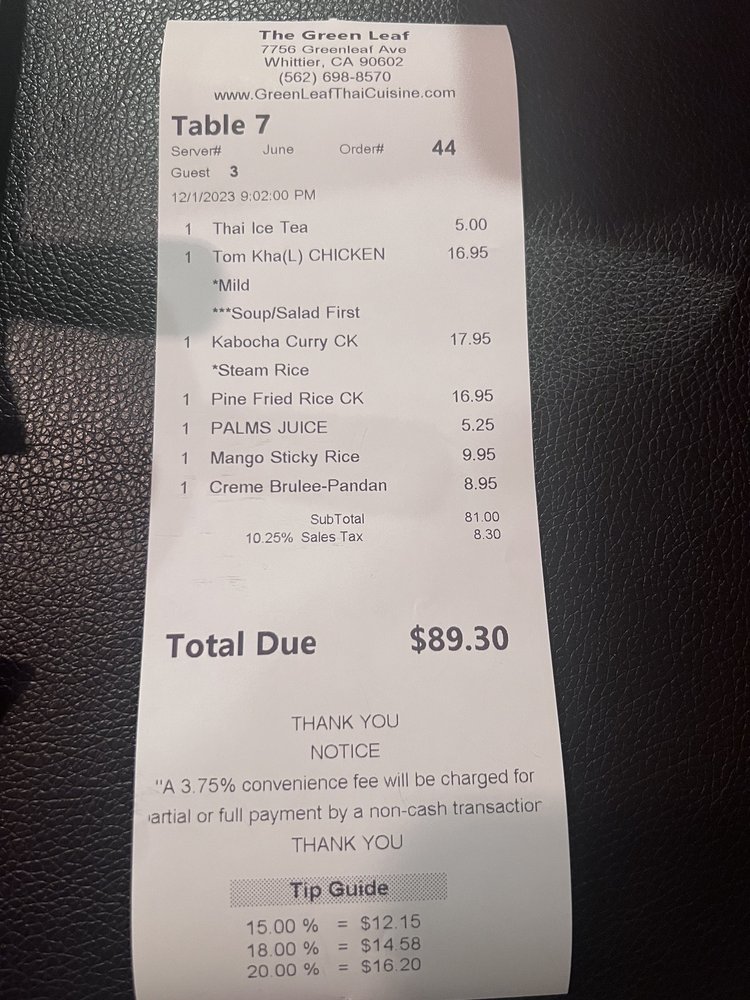 Introducing The Green Leaf Thai Cuisine, a top-rated Thai restaurant located in Whittier, CA. This restaurant offers a wide range of amenities, including delivery, takeout, vegan and vegetarian options, and more. The menu boasts a variety of protein and vegetable choices for their soups, curries, noodles, and rice dishes. Customers rave about the delicious food, excellent service, and welcoming atmosphere. The owner personally greets diners, adding a personal touch to the dining experience. The dishes are well-presented and full of flavor, with popular choices like green curry and pad see ew. The restaurant is known for its hospitality, making it a great spot for families and groups. Don't miss out on this gem of a local business for a truly memorable dining experience.